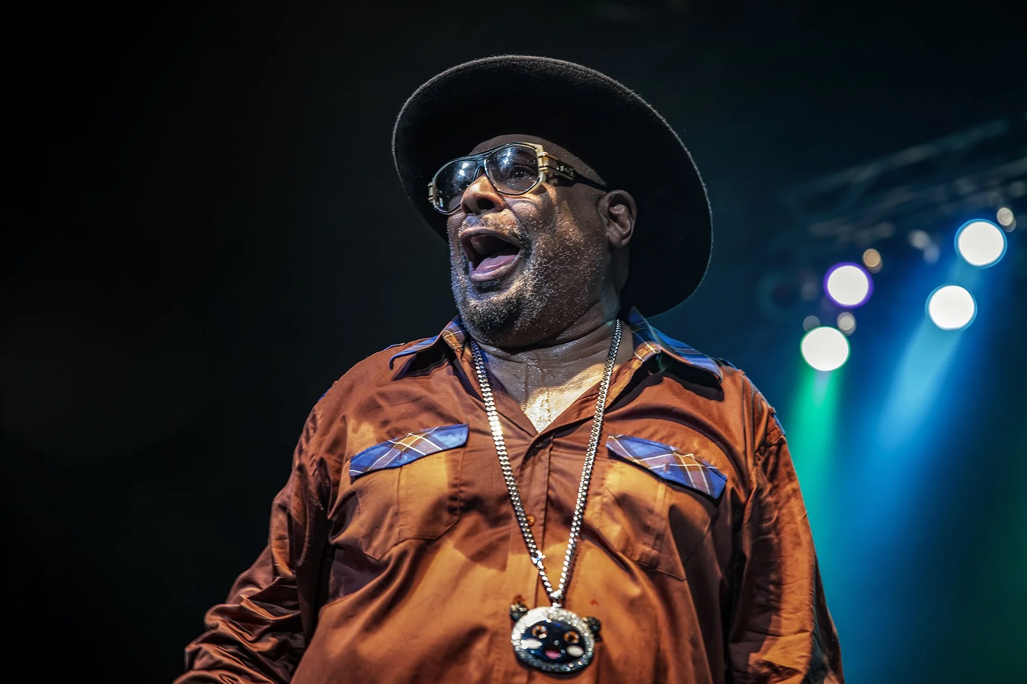 Clinton arrived on stage the way he tends to — unhurried, already in possession of the room — dressed in his copper satin shirt and wide-brim hat, his cartoon-character pendant swinging from a chain. At 75, he moved like a man who long ago decided that the music would do the heavy lifting, and it did. He spent portions of the set seated at the edge of the stage, holding court, gesturing outward as if conducting an orchestra he'd built over five decades. That is precisely what he has done. Parliament-Funkadelic is less a band than an institution, and the Columbus show made the argument that the institution remains vital.